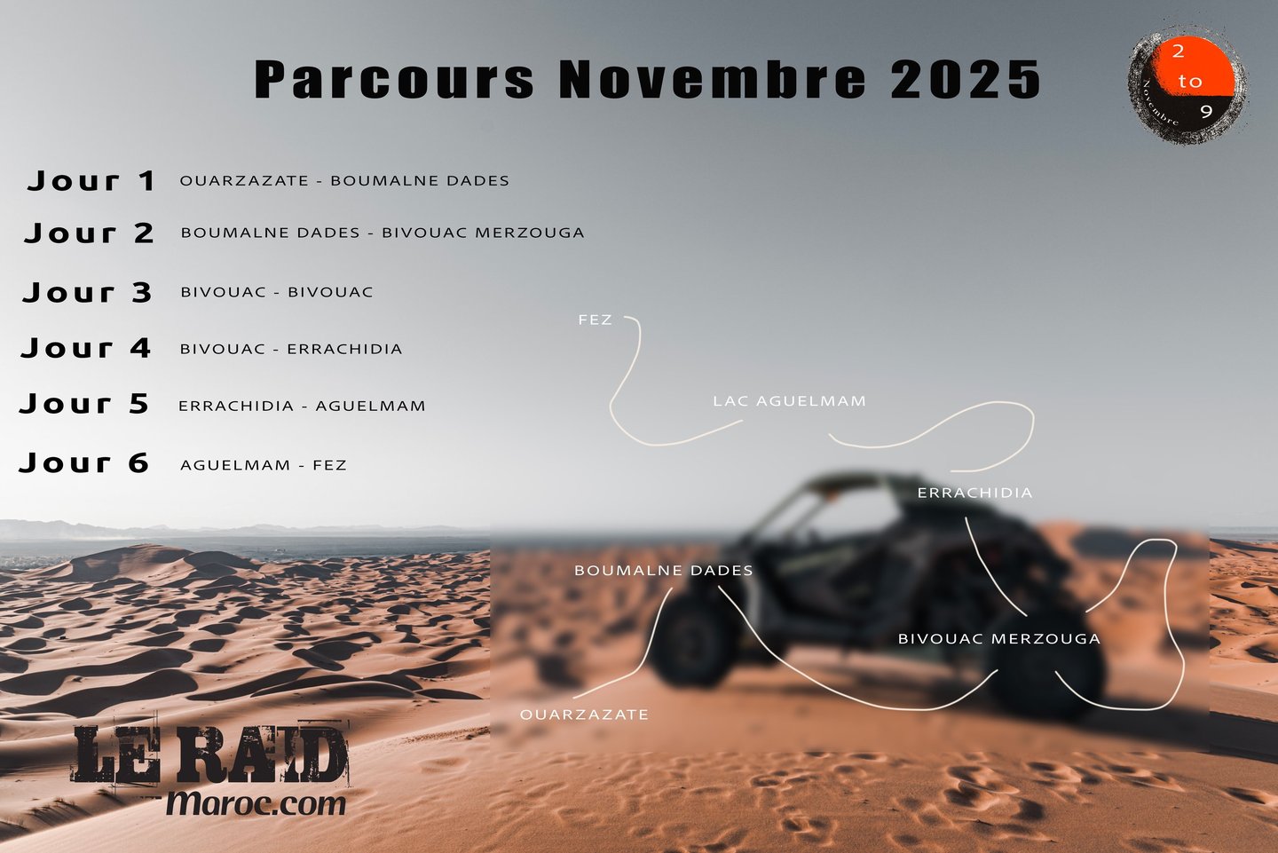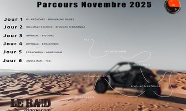 Plongez au cœur d’une expérience inédite avec Le Raid Maroc ! À travers des pistes sauvages et des paysages à couper le souffle, cette aventure tout-terrain est une invitation à repousser vos limites, à vivre des sensations intenses et à partager une passion commune.